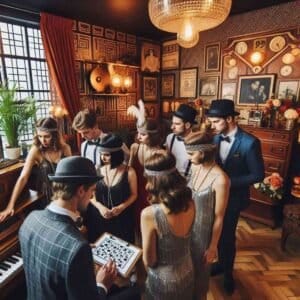 Festa a Tema “Assassinio Anni ’20”: Questo tema immerge gli ospiti nell’atmosfera affascinante dei ruggenti anni ’20. Abiti da flapper, gangster e jazz a tutto volume creano l’ambiente perfetto. La serata prende una piega inaspettata quando viene annunciato un omicidio. Gli ospiti devono risolvere il caso esplorando diverse escape room, ognuna delle quali rappresenta una scena del crimine in vari luoghi segreti di un’epoca proibizionista. Questo party è ideale per chi ama i romanzi gialli e l’atmosfera retro.