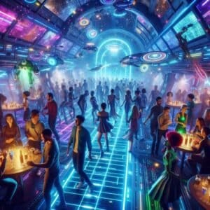 - Metaverso per Eventi Ibridi: Organizza un party che si svolge sia fisicamente che virtualmente. Gli ospiti possono interagire sia in loco che online attraverso piattaforme di metaverso, partecipando a giochi, eventi e attività sincronizzate.